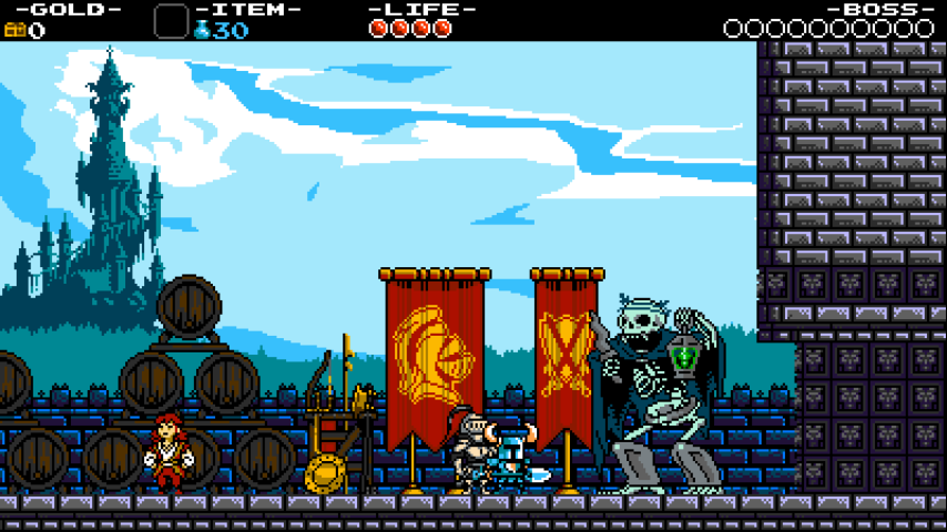 Shown above is the StreetPass Arena, the entrance to participate in StreetPass battles. It’s run by the infamous Passmaster Super Skeleton. Talking to Super Skeleton will allow you to participate in battles between two Shovel Knights in a format similar to Mario Bros: