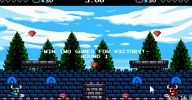 Even in the first battle, without subweapons, there were crazy goofy strategies. Like the 3rd round when the red Shovel Knight hid behind the wall and waited patiently, hoping the other Shovel Knight would be over the center area.