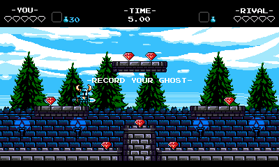 The battle takes place over three short, five second rounds. You do your best to collect gems while guessing where the opposing Shovel Knight will be and swiping at air hoping you’ll hit your opponent. Your opponent always starts on the right side and you will always start on the left side. So you can probably see there are clear paths the other Shovel Knight will take. Will he run above for two gems or below for three? Will he initially run backwards for the close gem and maybe if I’m quick I can peg him with the flare wand? There are lots of options and strategies; exploring and testing them out in various scenarios is a lot of fun!