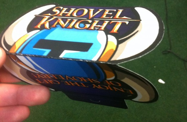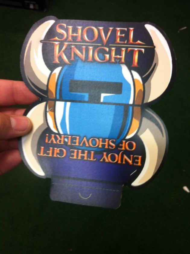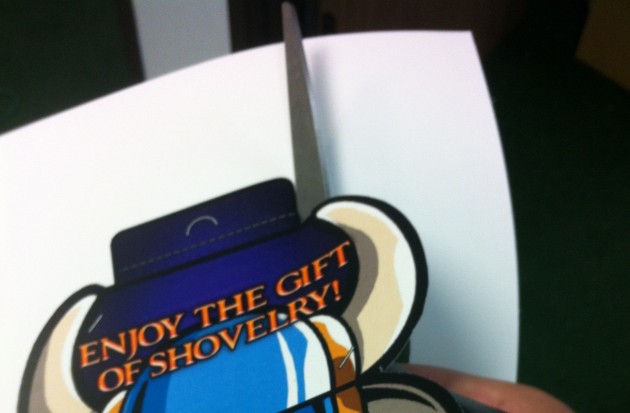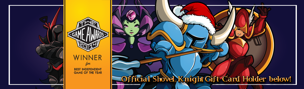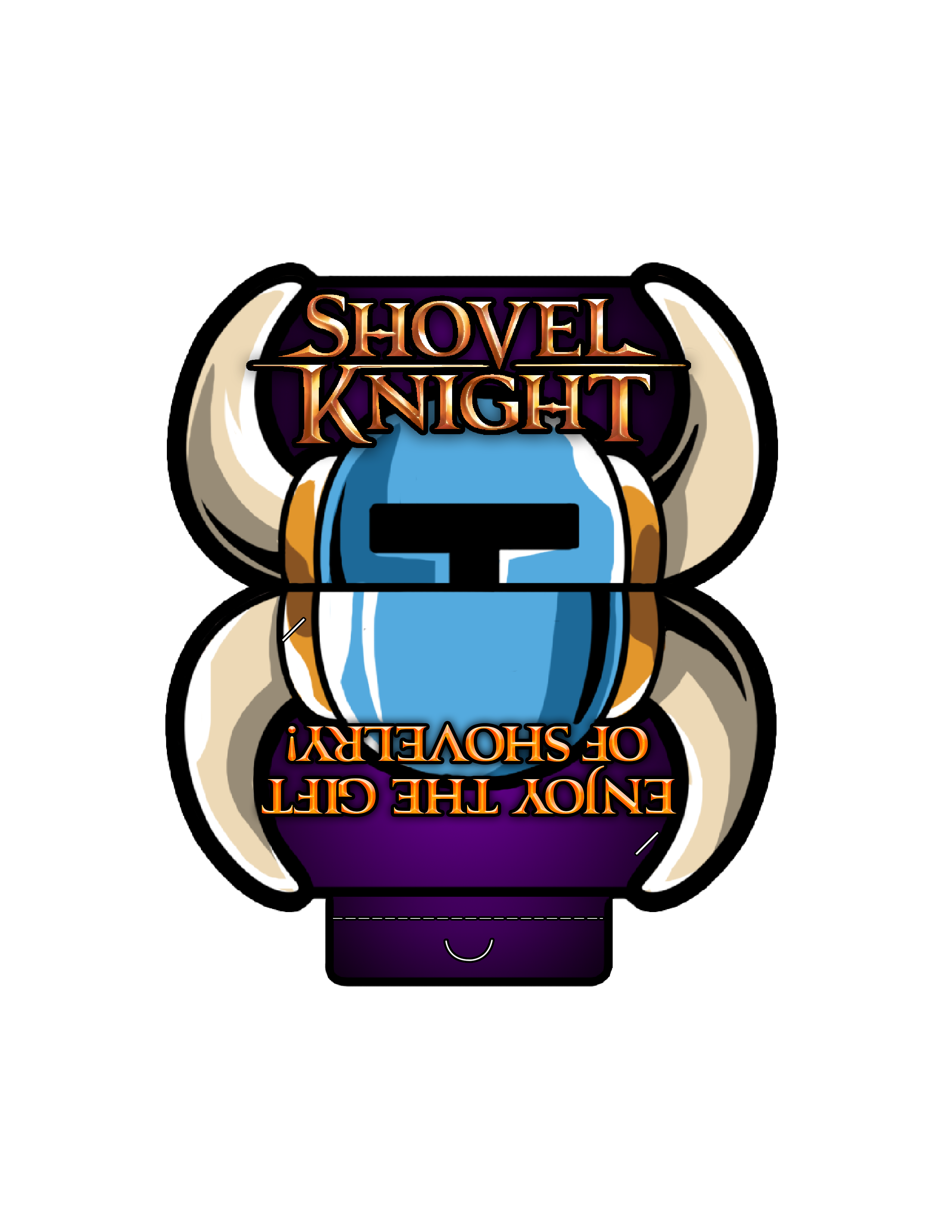 It’s gift-giving season, and we have heard that many of you would like to give Shovel Knight to friends and loved ones. We wholeheartedly recommend this, but there is just no good way to wrap up our digital game in present form!! Therefore, we now present to you the Official Shovel Knight Gift Card Holder. Simply print this out on a nice paper or card stock of your choosing, and slip a Nintendo eShop card into the holder. Viola! If you don’t have a card, then just write a nice message inside to let them know they got Shovel Knight!! Check it!