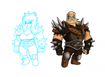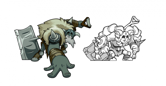 Besides the concern for hitboxes, Polar Knight’s original design effectively communicates his personality: a stoic, hulking, immovable mountain of a man and the female version needed to do the same. We tried a couple things to widen her shape including adding huge shoulder pads and armor but that all felt external to her. When that didn’t work, more simple designs were made, but they tended to lose the hulking character that Polar Knight embodies. The brilliant discovery that led us on our current path was the idea of giant, thick hair braids. That afforded us the opportunity to maintain her pose and attitude and also let her have the same broad proportions that her hitboxes demanded!