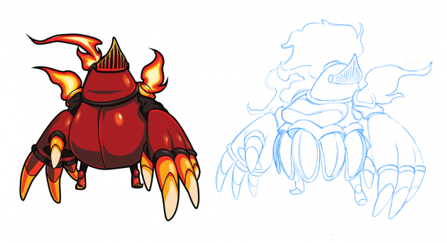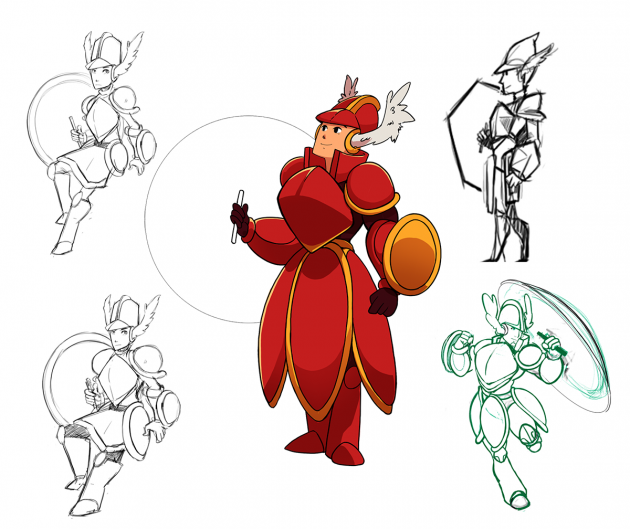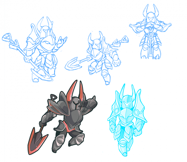 Here is the final sketch of male Shield Knight. Aesthetically, he looks much closer to his female counterpart than Shovel Knight does to her doppelganger! If you look closely, you’ll notice some of the ornamental particulars of his armor, such as the golden band across his chest plate, are missing. The pauldrons as well as his helmet have also been reduced in size to appear more masculine.