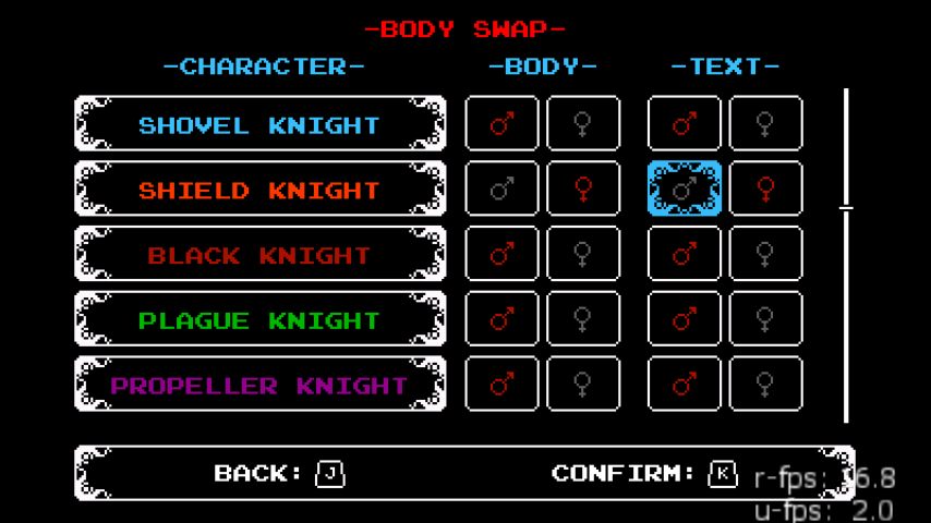 We would create the opposite bodies for our main characters: Shovel Knight and Shield Knight, Enchantress, Black Knight, and all the Knights of the Order of No Quarter. Each of these character swaps could be controlled independently, to give whatever mix of character bodies the player wanted. Finally, in English, the pronouns for each of the characters could also be swapped, so you could have a female character, referred to as her, with a masculine body or vice versa! This would all be controlled by a simple menu. Here’s how it turned out!