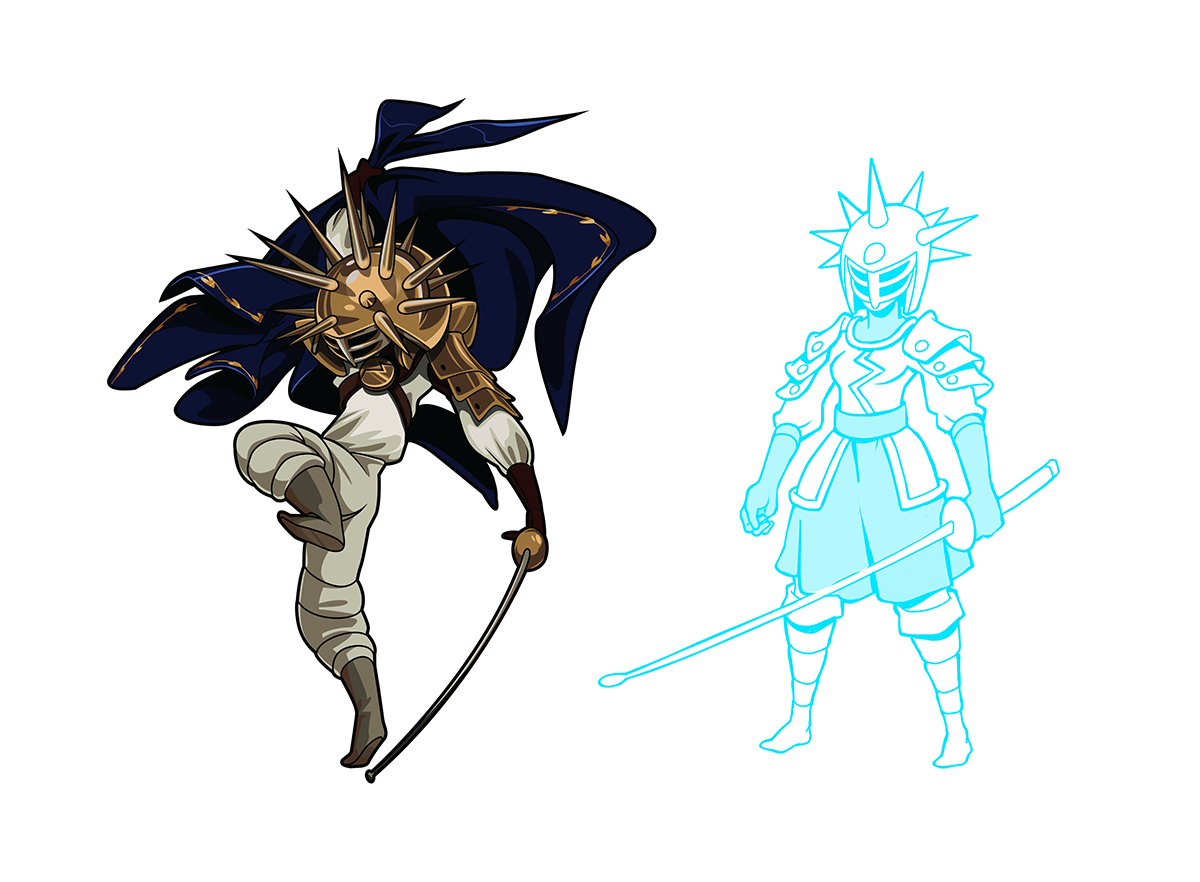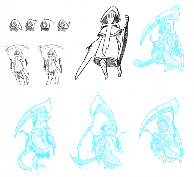 For Specter Knight, who already has a flowing cloak, we tried designing some more elaborate dresses while keeping her motifs the same: bones, skulls, and tattered but ornamental clothing. These ended up being a little hard to differentiate from the masculine Specter, so we went even further, even making a few designs that looked like a Yurei (that style of long-haired weirdo seen in ‘The Ring’). However, these additions ended up being too complex, ornate, or otherwise superfluous.