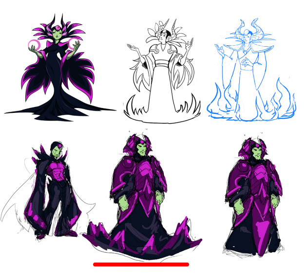 The original design was inspired by traditional Japanese attire, so we started with a kimono/robes that would feel similar in a male counterpart. This didn’t capture the original’s essence quite right. We moved towards a bulkier samurai inspired design instead. One of our artists was likely playing a lot of Ganondorf in Smash, as you can see elements of his same cold, mean spirit in this design.
