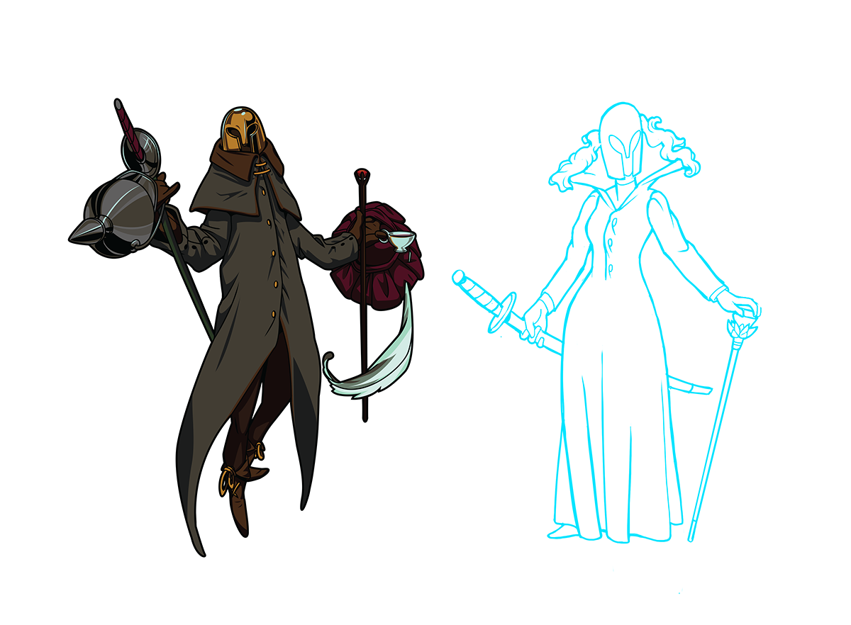 Plague Knight was particularly tricky due to not leaning particularly one way or the other in the gender spectrum. So we decided a costume change was the best way to distinguish the two forms.
