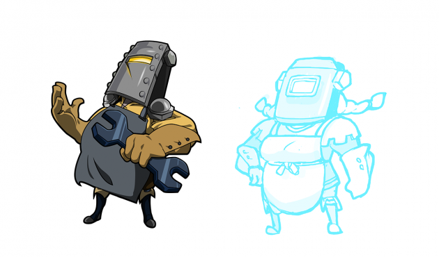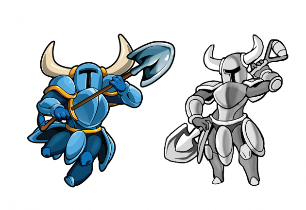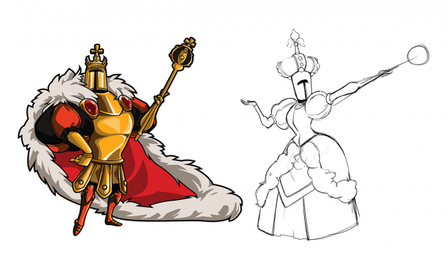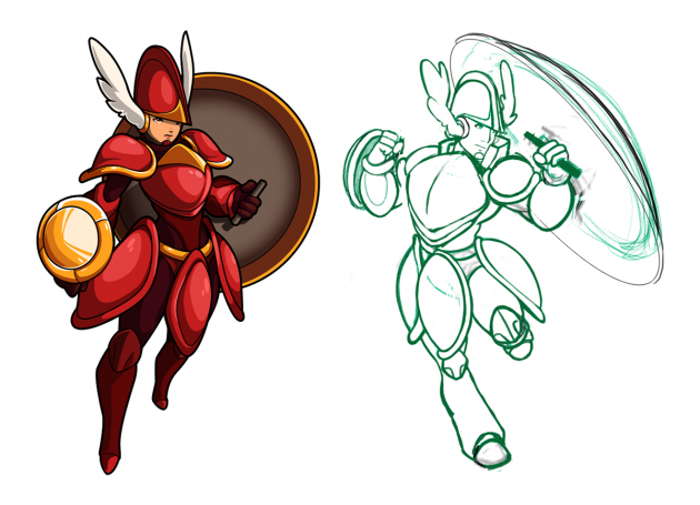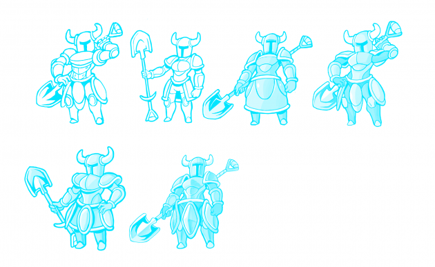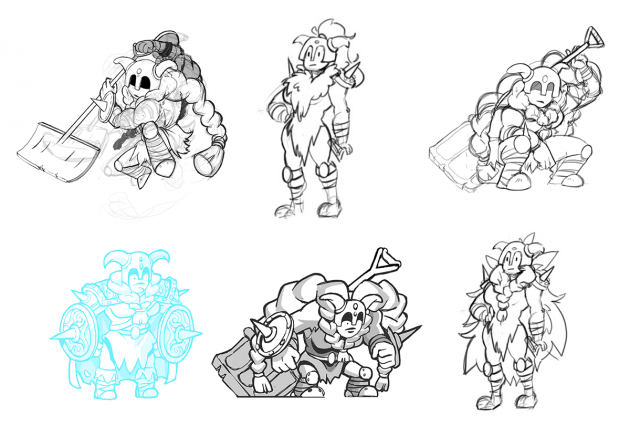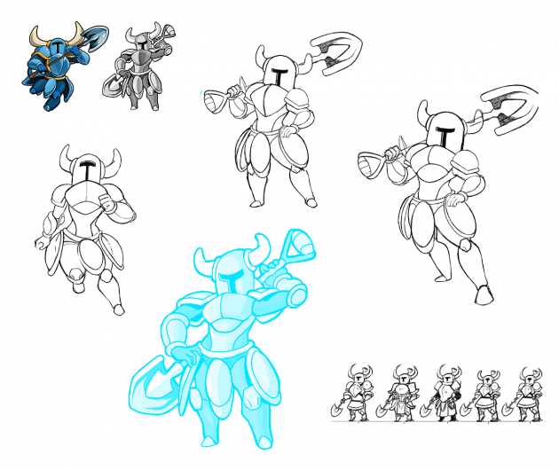 For Shovel Knight, we started out with some very basic ideas. Since we don’t have a face to work with, the easiest way to illustrate a more feminine form was to change the body shape.