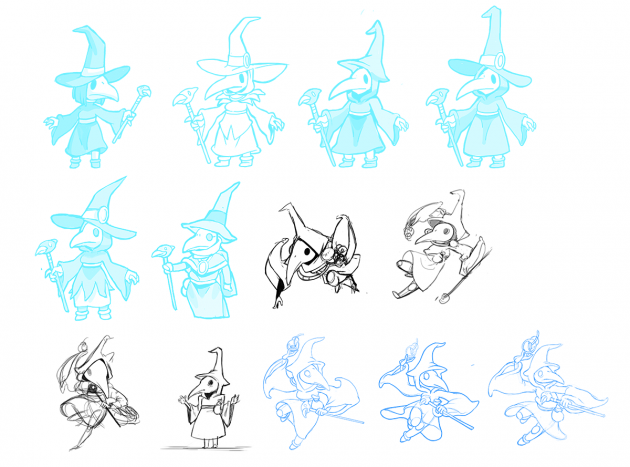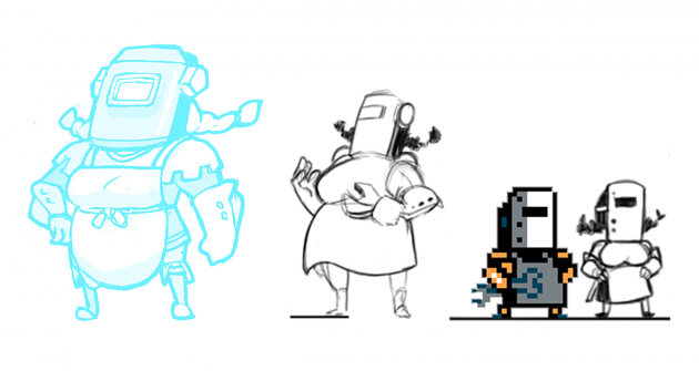 Because she’s so tiny, there wasn’t a lot of room to work with Tinker Knight’s design. The pixel model is so small that we were worried about the differences even showing up! We figured we could enhance the effect by making the animation poses a bit different, but we still needed to explore the design. We ended up changing her design only by about 10%, and adding some no-nonsense ponytails for this hardworking character.