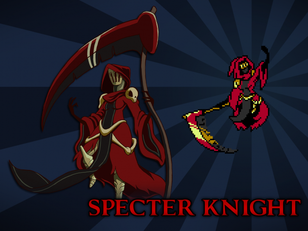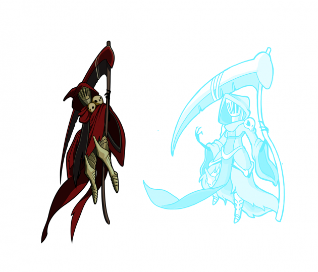 The final design for feminine Specter Knight retains the tattered dress, and has a little bone ornamentation here and there. Her design in the concept art looks a little more stout than masculine Specter Knight, but it’s the dress and pose- she actually is the same size. Once again, making the characters fit into the same visual space was paramount.