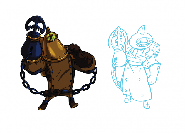 Treasure Knight provided a similar challenge to Polar Knight- creating a female character that allowed a similar size and silhouette to work within the boundaries of the hit boxes. And like Polar Knight, this character was one of the most fun to redesign! Treasure Knight’s arrogance was important to capture, too.