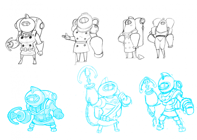 First, we decided to make the oxygen tank on her back into a dual-chambered one, to bulk out her form a bit more. We looked to the dual-chambered jetpack in The Rocketeer, that old 90’s classic, for inspiration. Male Treasure Knight wears a weird kind of bomber jacket, but a trenchcoat felt more natural for female Treasure Knight, especially with the added bulk it afforded. Essentially, it’s just an elongated version of the jacket! For her mask, we tried to riff on the original design, but it looked too top heavy and awkward. Instead, we swapped it for an oval design, but retained the characteristic fin and mask shape.