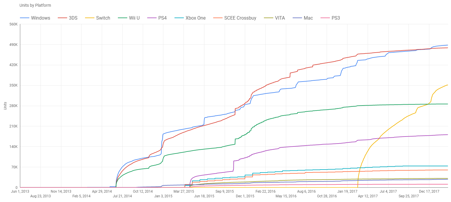 - We sold over 125k more units in 2017 than 2016! But 60% of those units were sold on Switch. Outside of Nintendo platforms, our sales dipped by about 30% in 2017. However in total, 2017 was our second best year in unit sales.
