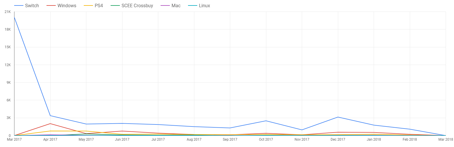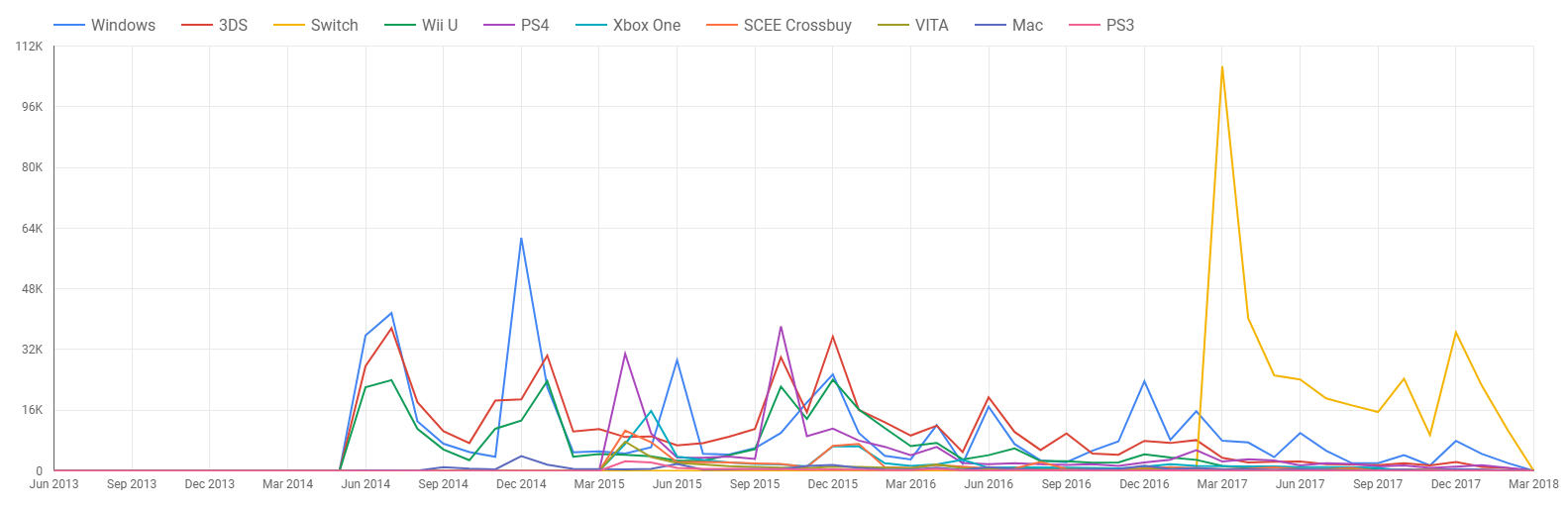 As other games have experienced, Shovel Knight has sold faster on Switch than on any other platform! PC was the previous leader for units sold in the first month at ~70k. Switch broke that record by selling around 110k during its launch month. Switch’s breakout success can most clearly be seen in our monthly graph below.