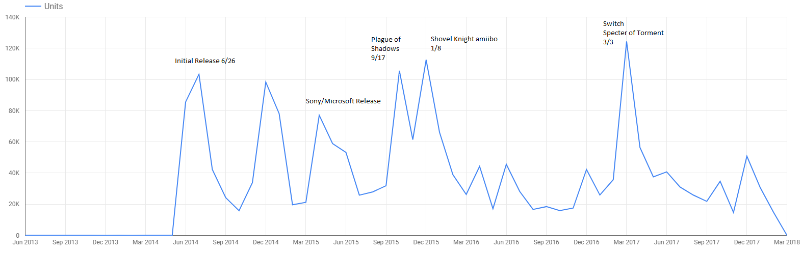 Although Specter of Torment standalone was exciting, more exciting was the attention its new release brought to Shovel Knight: Treasure Trove’s launch on Switch. This sales potential, of course, is hard to quantify. Were people buying Shovel Knight: Treasure Trove because they wanted the full game or because they were interested in playing the new campaign? Since we can’t really be scientific about the Switch, let’s instead take a zoomed in look of the sales on non-Switch platforms: