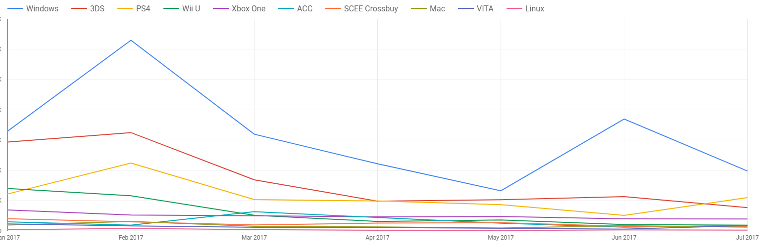 - We sold about 2000 units on 3DS in October 2017 compared to about 4500 in October 2016. This leads us to believe that 3DS is still fairly strong (it isn’t too far from the game’s natural decline).