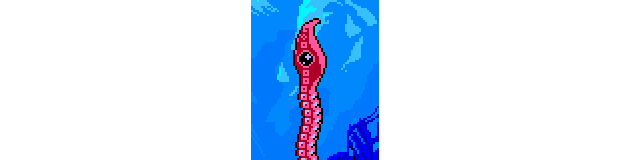 To illustrate how we develop a stage design around an element, let’s look at Specter of Torment’s introduction to a single enemy, Grapps! Found mostly underwater, Grapps is a long tentacle enemy that shoots in from offscreen. The part with the eyeball can be attacked, but the rest of the long tentacle is completely invulnerable. Unlike most enemies, you can’t walk through Grapps, which means it can be used to block the player, creating puzzles. Eventually, we want players to be Dash Slashing through these dangerous tentacles and other enemies and sailing across the seabed like a cool grim reaper! But we need to get the player familiar with the enemy first.