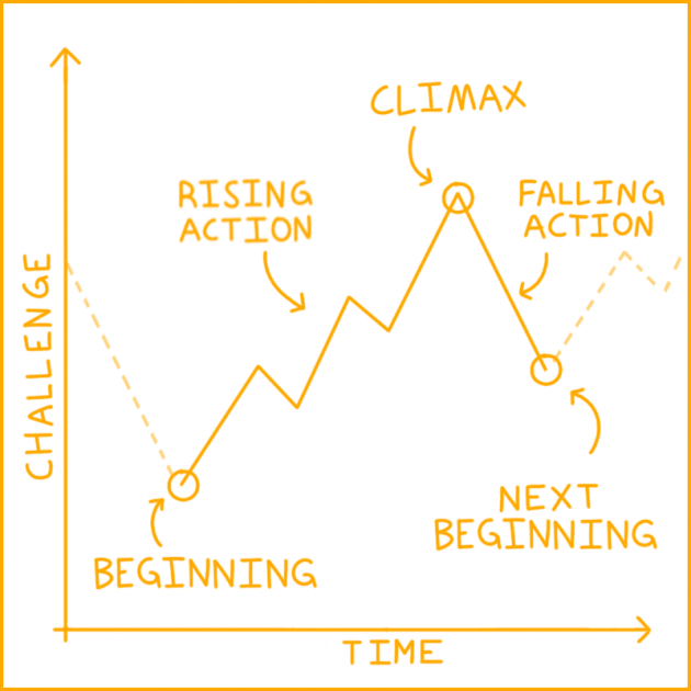 This graph was originally created to apply to story structure, but it works equally well in describing game difficulty ramping. Start simple, make it more complex and difficult, then pull back and do it again.