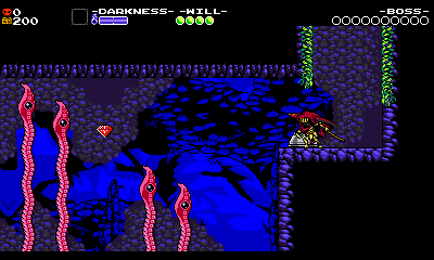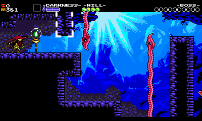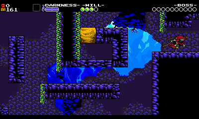 Let’s look at our first room of Grapps in the game, and see how it teaches those lessons. By this time in the game, the player has already completed the first stage and defeated a boss, so we are reasonable assuming they’re pretty familiar with Specter Knight’s mobility set of wall climbing and Dash Slashing.