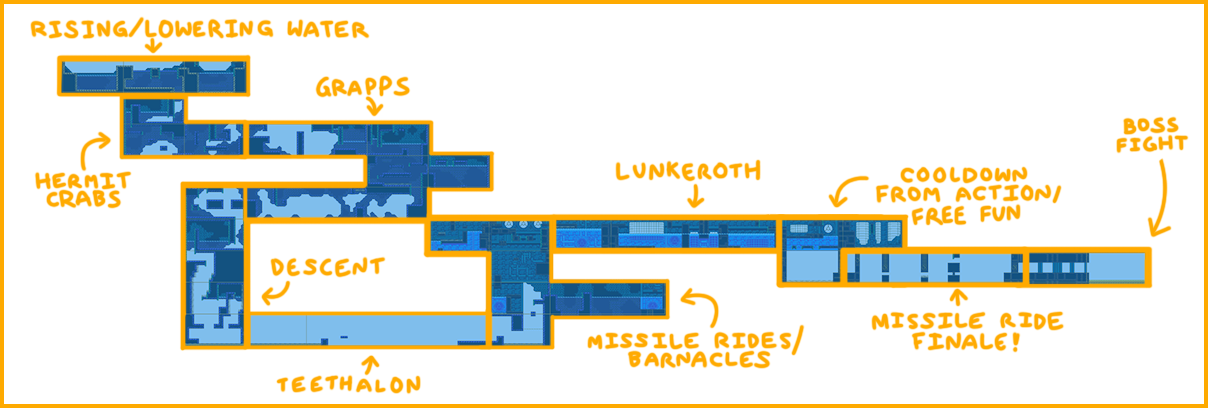 This type of connection is part of why we try to choose each stage’s elements to work together – a good level isn’t just 30 good rooms in a row. It’s 30 good rooms with tightly-intertwined themes and mechanics! Good level design is also good mechanics design. Every videogame is a soup, and tasty soups have flavors that blend!