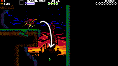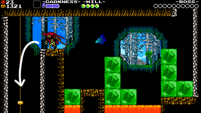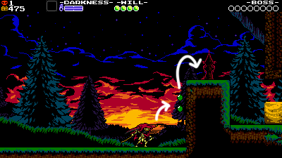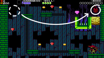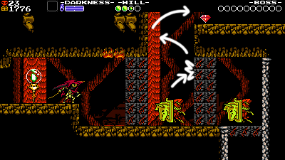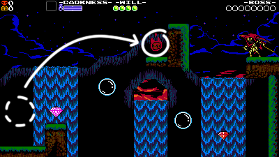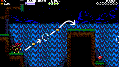 By placing these gems just above where Specter Knight stands while he’s riding on the platform, we can introduce a little bit of spice to an otherwise straightforward setup.