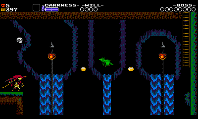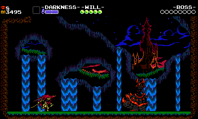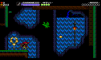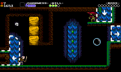 In this room, the shape of the cave itself is being used to break up the player’s actions and suggest how to navigate the room. The things you need to Dash Slash are ‘circled’ by the cave’s arches to highlight them, but also lined up with the waterfalls below to better convey the distance between them. The areas of the room where Specter Knight needs to descend after a Dash Slash are set in front of long, vertical cave pillars that line up with your path. Hopefully, this guides the player in subconscious ways. We love crafting patterns like this all throughout the game, but they should never look contrived!