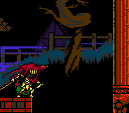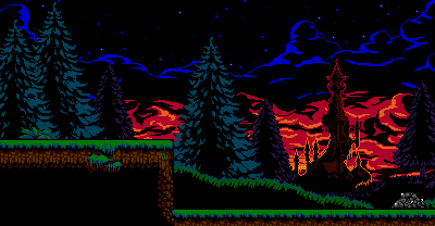 For our opening shot, we see the Tower of Fate standing tall in-between the trees on the right side of the screen. Then as the player moves to the right, the tower becomes more obscured by trees and caves. The tower gets out of the way of the composition so that the player can focus on the foreground as they learn Specter Knight’s wall-climbing mechanics for the first time. Once the player transitions into the last screen, the tower comes back into view, lining up perfectly with the cliffs on either side, beckoning you from the horizon.