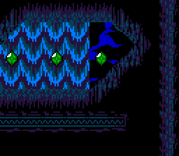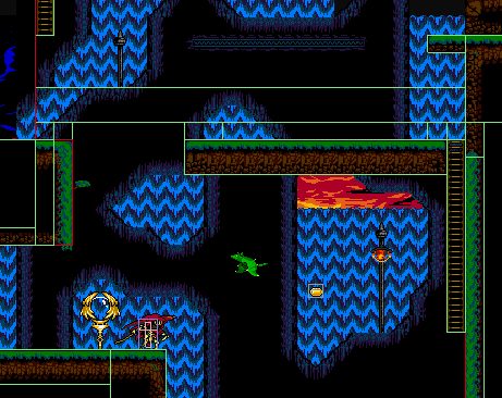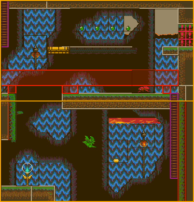 The same waterfall tiles are being used here to separate this room into two sections – danger and safety. Throughout the room, you’re diving down in front of the waterfall in moments of danger and rising up above it in moments of safety. It connects the feeling of the gameplay to the environment around it. Without that waterfall it’d still be a fine room, but you’d lose the feeling of pushing up against the current and climbing out triumphantly.
