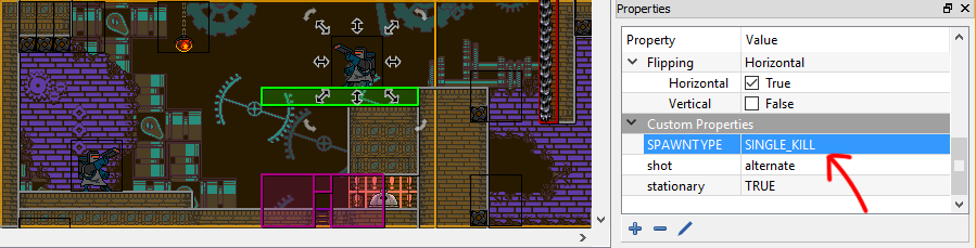 Back in our level tool, we have to set that Cogslotter’s SPAWNTYPE to SINGLE_KILL, so that they won’t respawn after you defeat them.