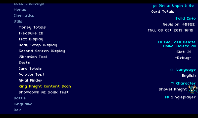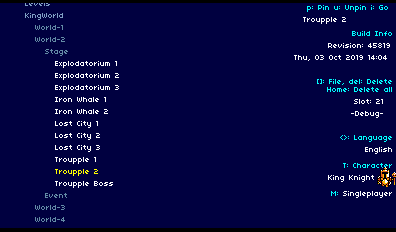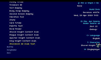 In the gif above, all of the options being set are saved and displayed in the top right corner. You can “pin” a particular stage, allowing you to immediately boot straight into that level with certain settings. For example, if a programmer is testing multiplayer battles against Plague Knight and Polar Knight in the Lost City, they don’t need to setup a special case in code to allow their team to iterate on their gameplay. It’s all tuneable through the handy Dev Menu!