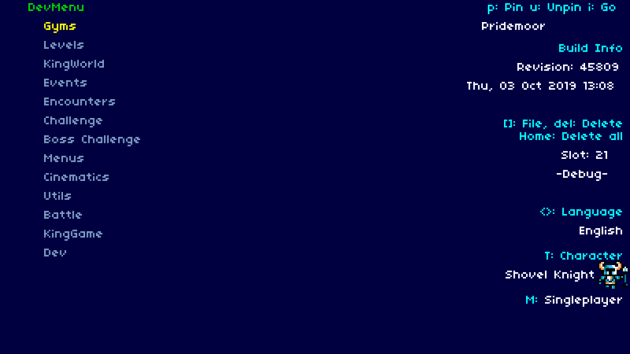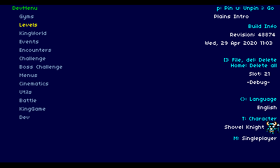 Normally, when a player boots up Shovel Knight, they’ll see the Yacht Club Games logo and a title screen. However, when you load up a developer build, you see the screen above! The Shovel Knight Dev Menu is a separate state that lets you load into the gameplay. You can boot into the stage you’d like to play, set your character, set up multiplayer options, switch your save slot, and much more! At any point in the game, you can quit out and return to this menu. The Dev Menu gives you a lot of flexibility to jump to various points of the game and iterate quickly!