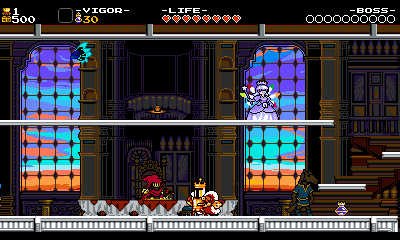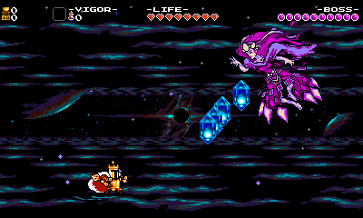 We originally wanted to have King Knight travel to the moon at the end of the game… but we had to stop ourselves or else development would go on forever. So instead of going to the moon, King Knight is warped to a celestial plane to battle Giga Cardia, King of Cards’ final card-related challenge. To show her Joustus supremacy, we gave her all the abilities from the other bosses.