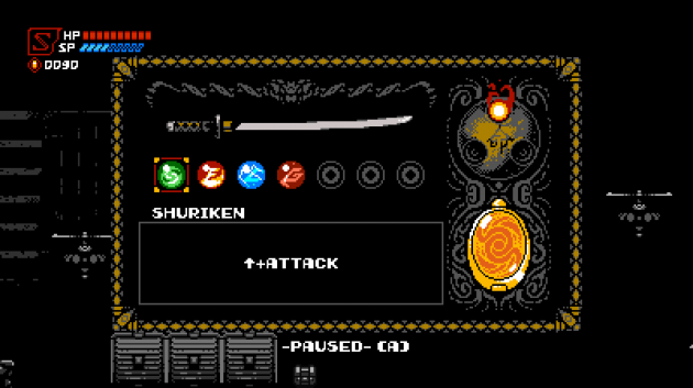 Press START whenever you’re in control of Shadow and you’ll open the inventory screen. Here you can check the available skills and the number of HP upgrade shards (collect three to gain +1 maximum HP). Highlight a skill by moving the cursor left and right to see the skill name and button combination.