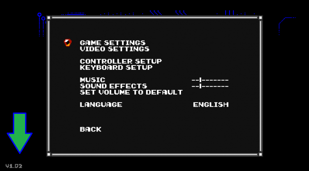 Want to confirm what version of Cyber Shadow is on your system? Go to the Title Screen, select Options, and check out the bottom-left part of the screen.