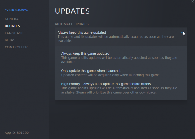 If automatic updates are enabled, then Cyber Shadow will update in the background while Steam is running. Otherwise, you can choose to update Cyber Shadow the next time you launch the game.