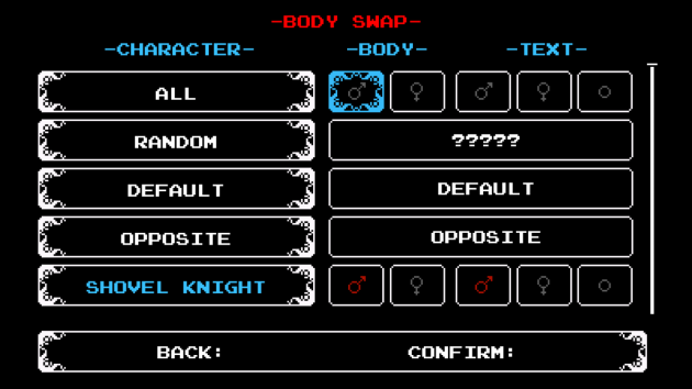 After creating a new save file from the profile select screen, you’ll be asked whether you want to enable Body Swap mode. This allows you to customize the appearances and pronouns of Shovel of Hope’s main cast.