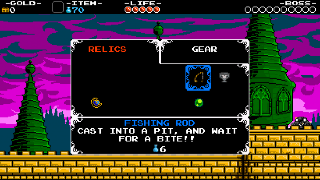 Here you can check your armor and Shovel Blade upgrades, and other collected items. Press B to switch between your Relics and Gear Tabs.