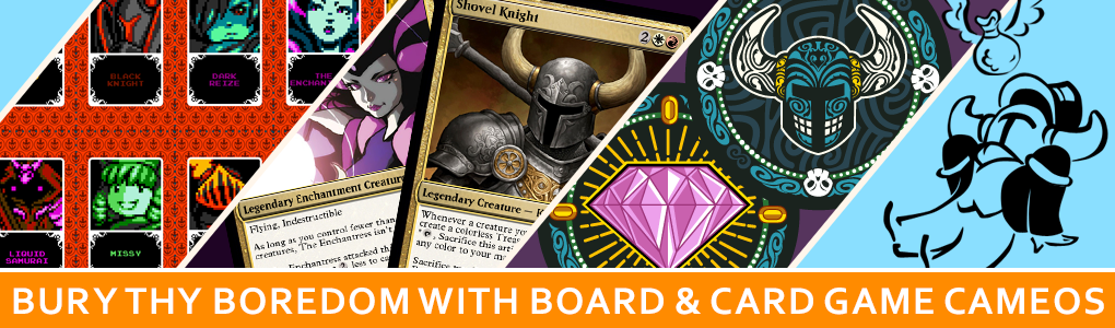 That’s right friends, Shovel Knight is going to be making appearances in all of your favorite board and card games!! And best of all, it’s happening right now, courtesy of your pals at the Yatch Club! Scroll on down for a true extravaganza of unofficial, parody, very legal cameos featuring your favorite knight that digs. These additions should spice up your next game sesh, especially if you’ve been stuck inside lately as many of us have. There’s a lot to check out, so read up and then print ’em out, cut ’em up, and get playing! Have fun, and don’t forget to send us pictures!!