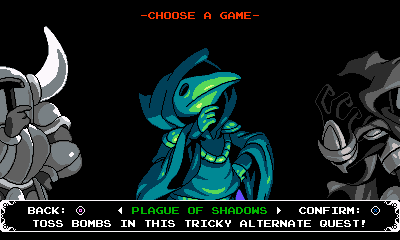 Plague Knight’s main screen is a little different from Shovel Knight’s.