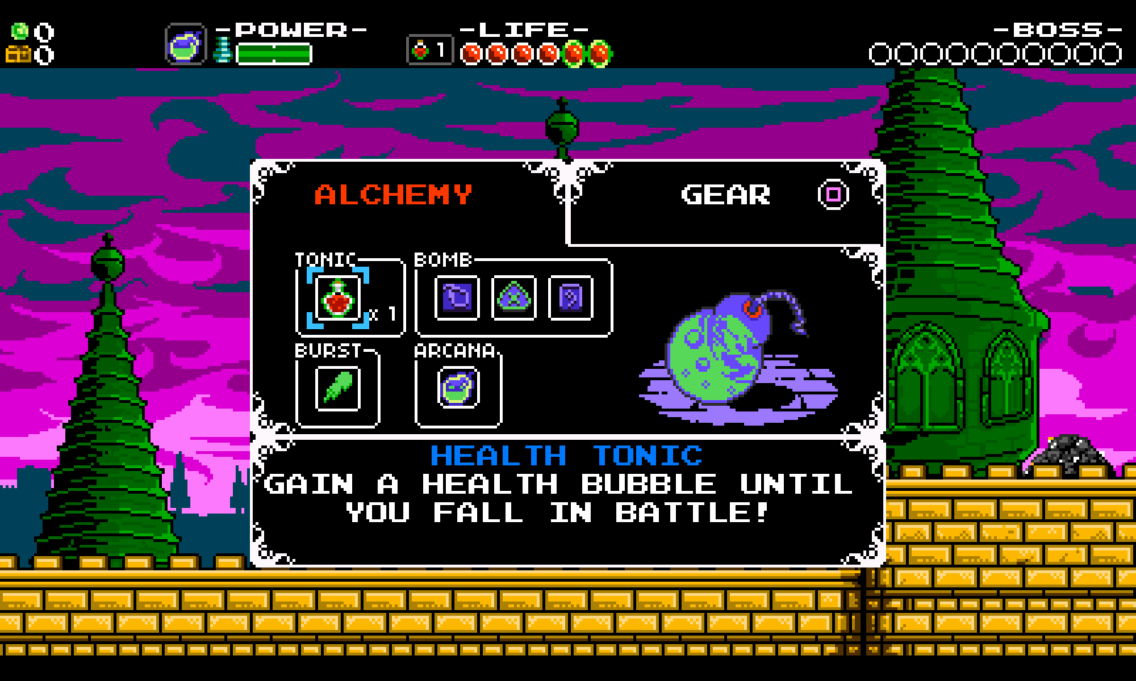 Plague Knight can quaff a health tonic to increase his Maximum Health by one bubble! However, if Plague Knight falls in battle, the tonic’s effect is lost. Make sure to keep lots on hand, just in case!