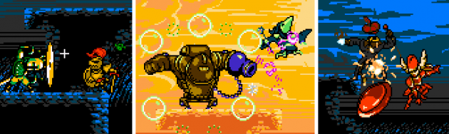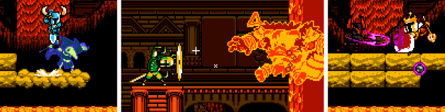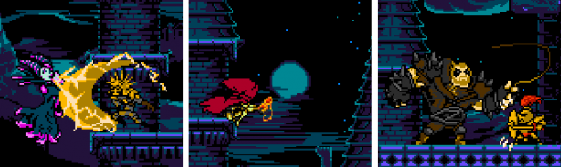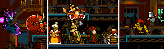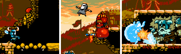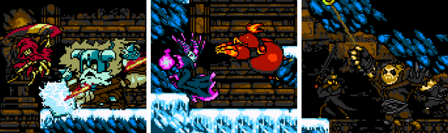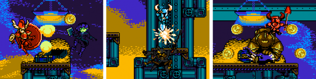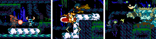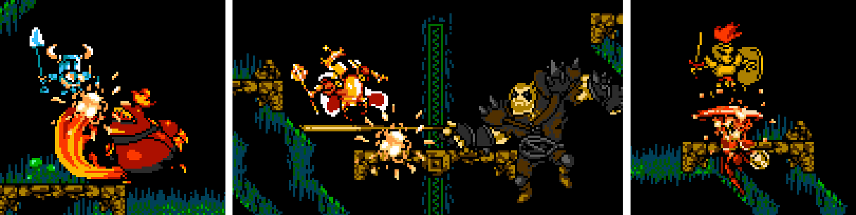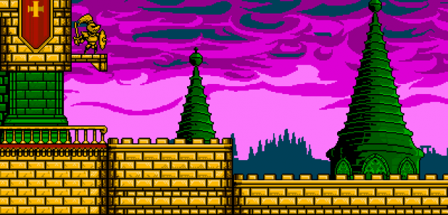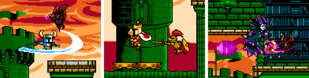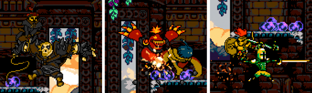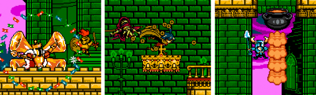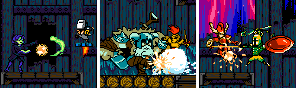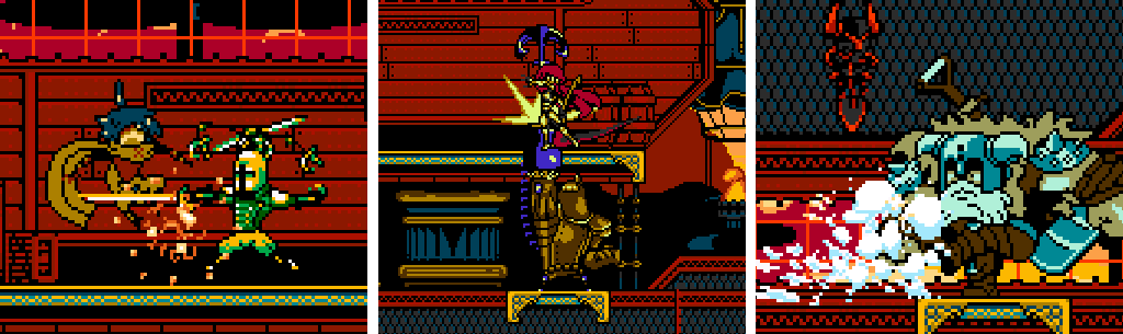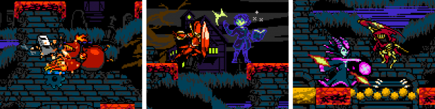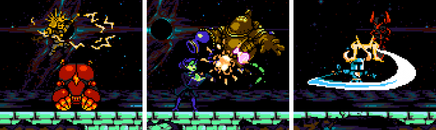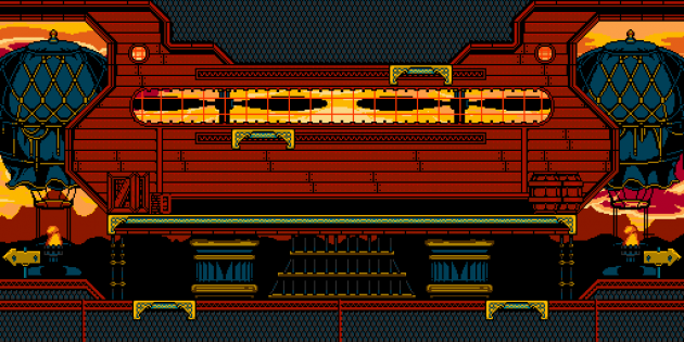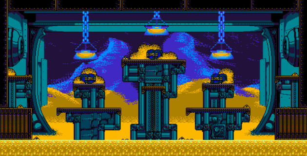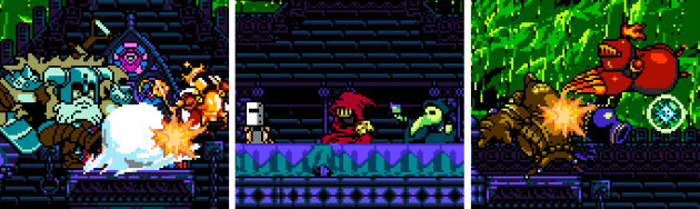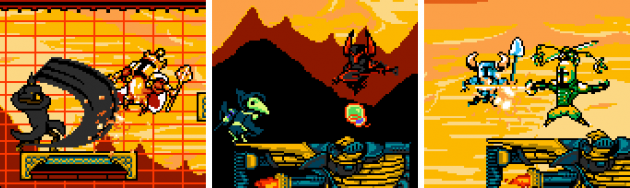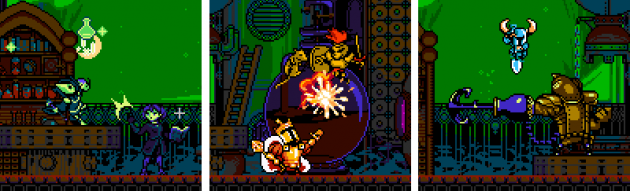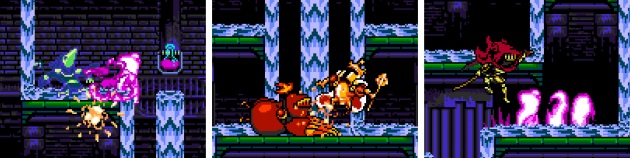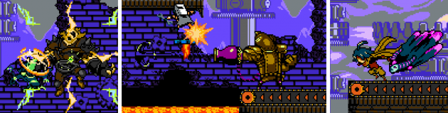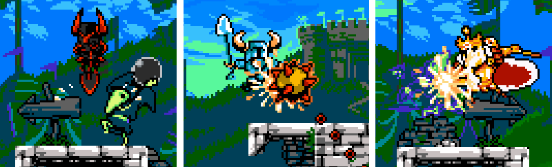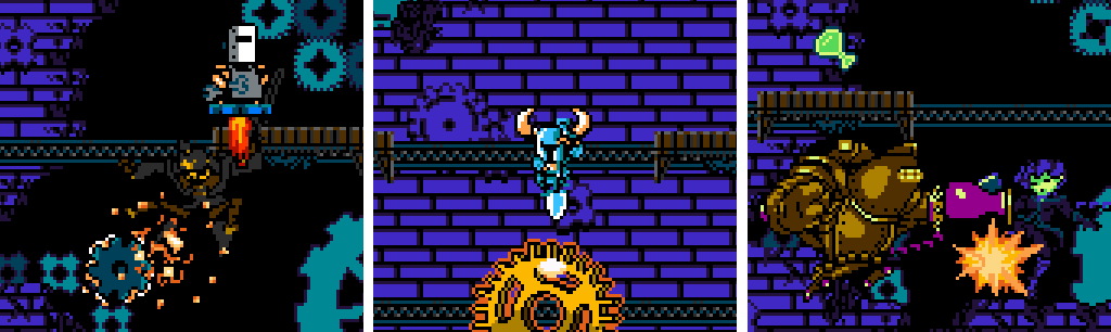 So many gears! Tinker Knight really can’t get enough of them, huh? The edges of the screen are safe and wrappable. Balancing and landing a blow in the center takes some hard work! Watch out for the gears at the bottom, but don’t be afraid to fall. Wrapping from the bottom to the top of the screen can really throw off your opponent.