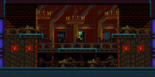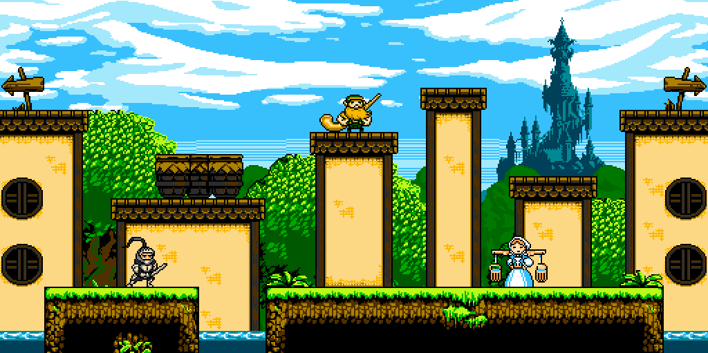 This scrolling tour features many famous locations from past adventures. There are many sections. Beware of pinch points! The beginning starts calm, then begins a platform heavy climb. A visit to the Order of No Quarter is next..watch out for the chicken! It ends with an all out race to the bottom.