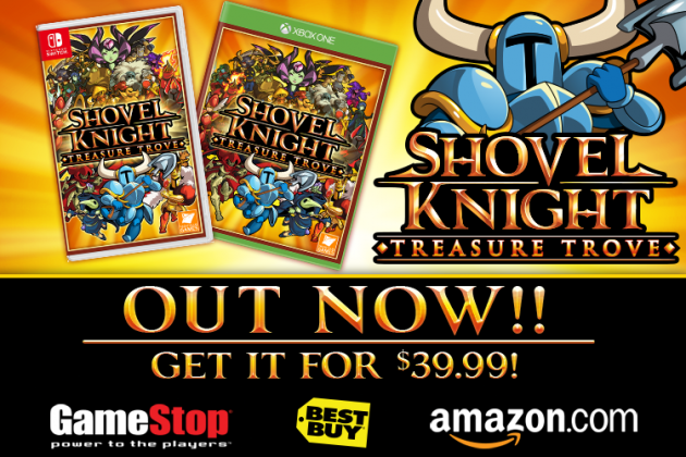 With Shovel Knight: Treasure Trove, you get it all. Play with a friend in Shovel of Hope’s cooperative campaign, test your mettle in full-featured challenge modes, battle together in Showdown, and change the game with Body Swap mode. Uphold the virtues of Shovelry, earn relics and riches, and discover the true meaning of shovel justice!