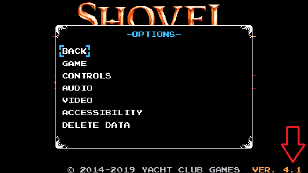 Want to confirm what version of Shovel Knight is on your system? Go to the Title Screen, select Options, and check out the bottom part of the screen.