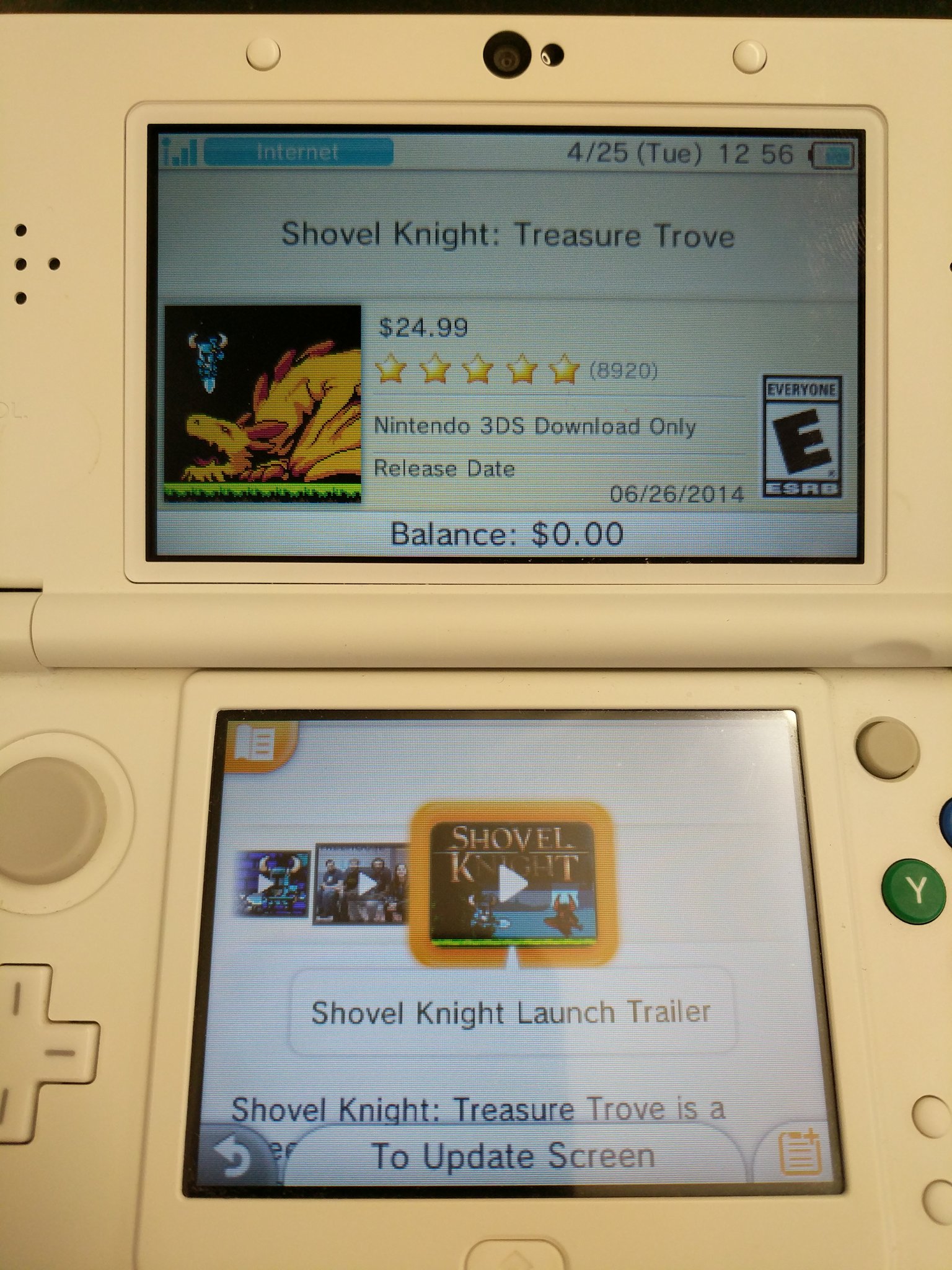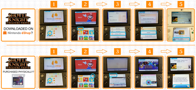 Patch Not Working (DIGITAL & CARTRIDGE): There are two methods for playing Shovel Knight on 3DS (the version downloaded from the eShop and the cartridge version found in a store), there are also multiple listings for Shovel Knight the eShop. If you tried one method for the patch but didn’t see the game update then try using the other.