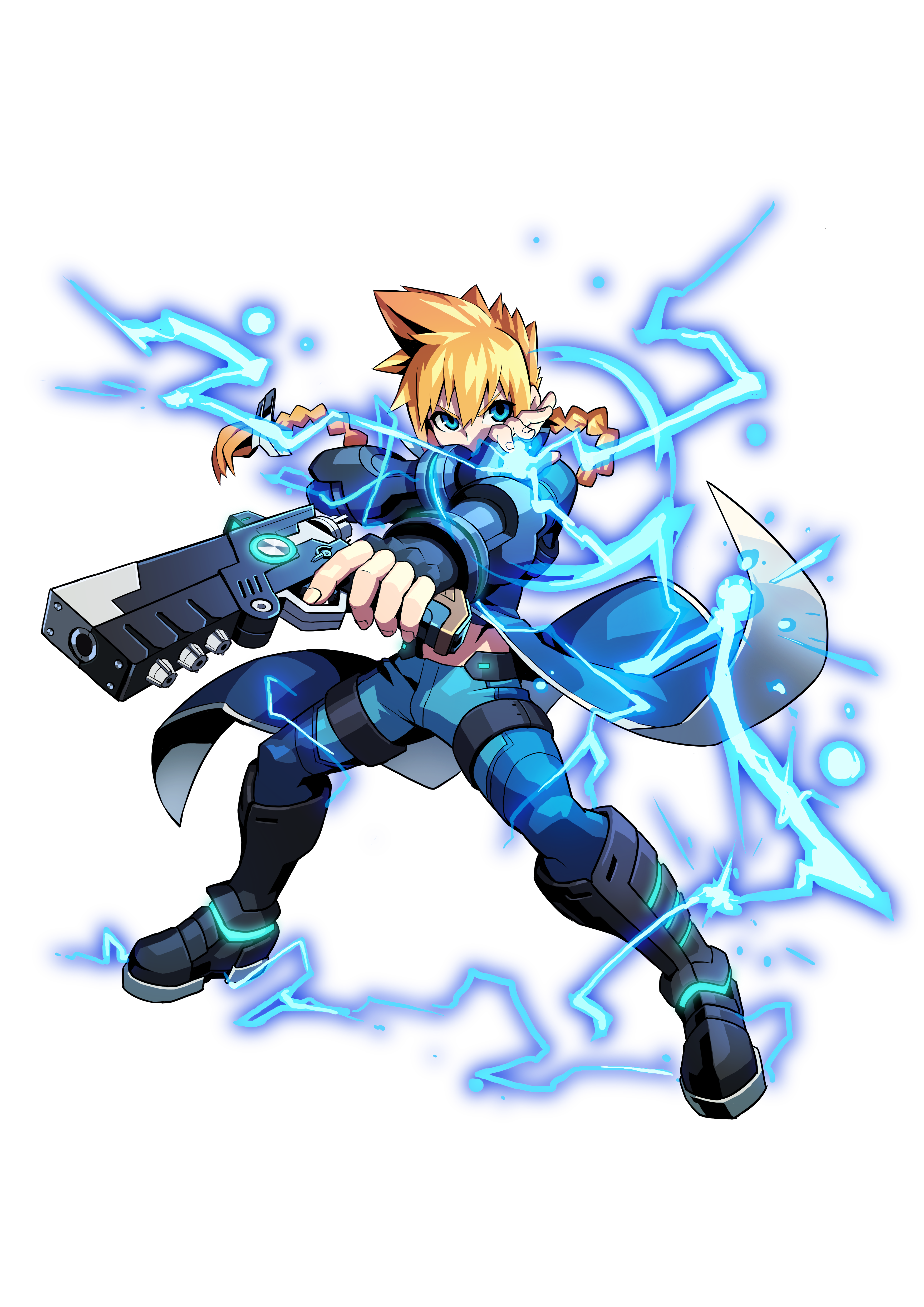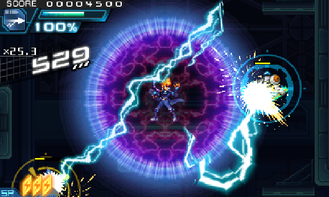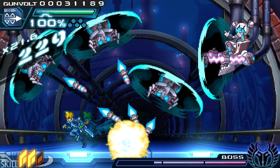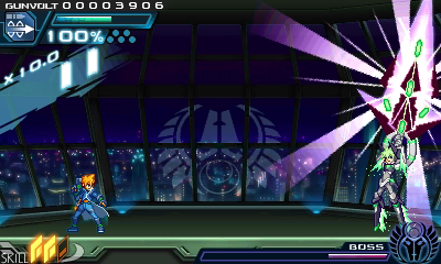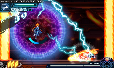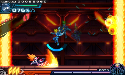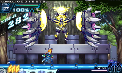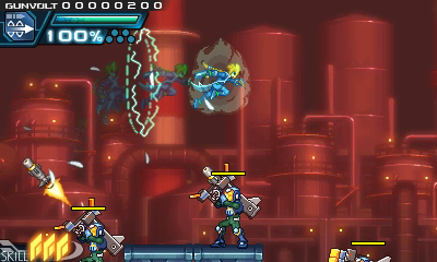 Tag enemies with your weapon, then shock them into oblivion with Gunvolt’s lethal Flashfield technique! Advanced players can try for bonuses and higher scores by defeating two or more enemies at once. - A powerful new enemy emerges!